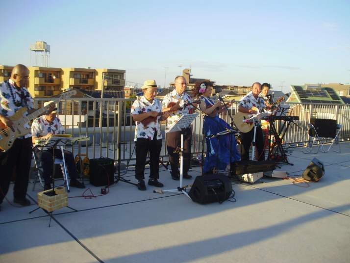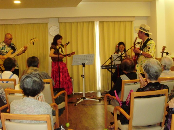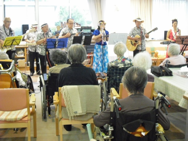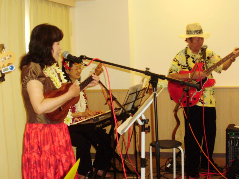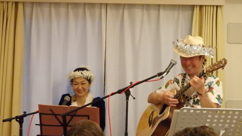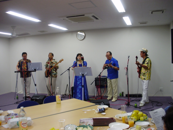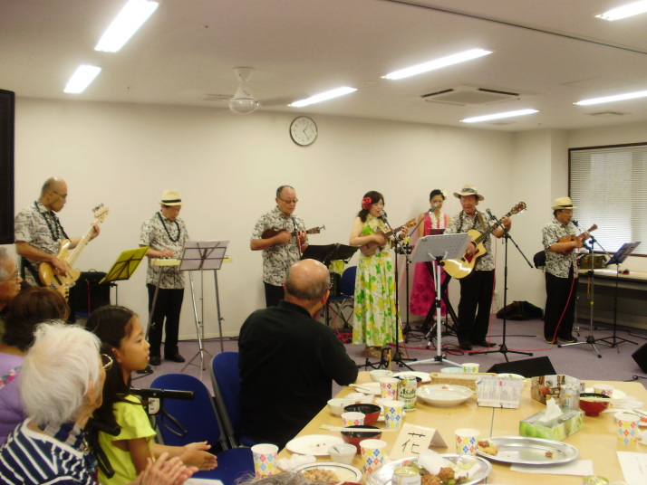 ポピュラーなHawaiianをお聞かせした他、全員参加(約70名)で「浜辺の唄」「上を向いて歩こう」「知床旅情」を大合唱。
